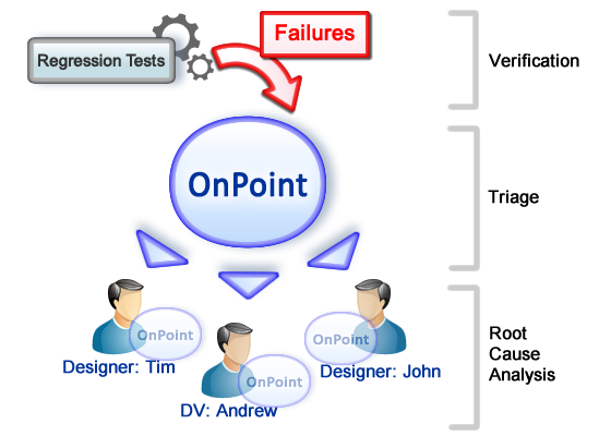 OnPoint is the first verification tool with a triage engine that can automatically differentiate between failure sources. The process starts automatically when the regression tests fail by utilizing OnPoint to perform a root-cause analysis that generates a list of suspects